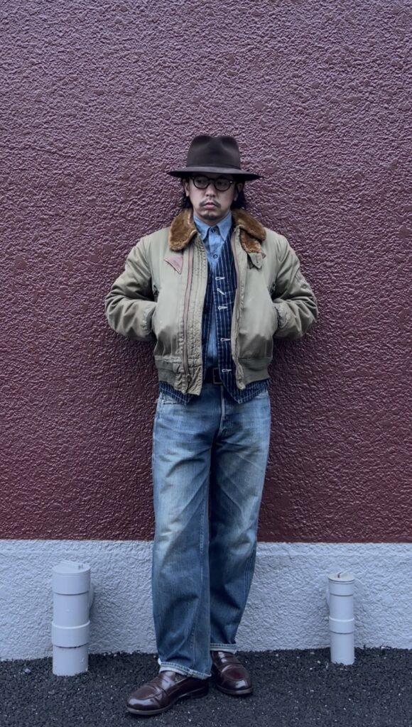 定番ながら全体のシルエットには気をつけて少しゆったりとしたデニムパンツにタイト目なB-15Aを着てややAラインを意識したシルエットにしつつ、このままだとデニムもB-15Aも無骨さが強いので革靴やハットでキレイ目にして調整。インナーのベストはストライプのウォバッシュ柄で少し遊びを効かせました!!