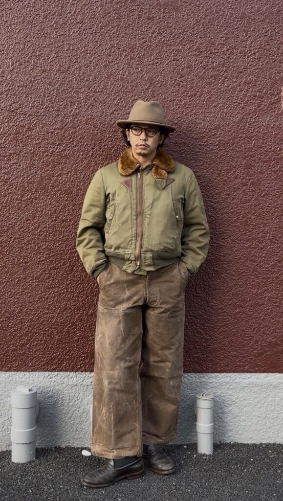 いっその事土臭く茶色でまとめたB-15Aコーデ!!ハット、パンツはもちろんメガネやファーの色、三角形のオキシジェンタブも茶系。靴は黒だけど実は茶芯で茶系が入った色味で統一感を出していく!