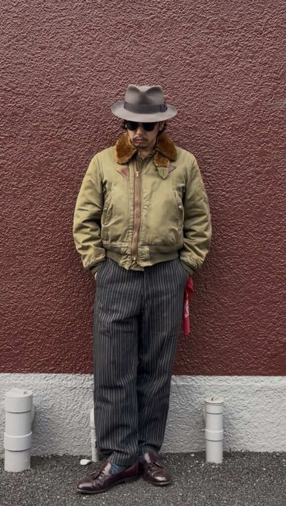 上品なストライプのフレンチワークパンツと、靴は弁護士の靴とも言われるタッセルローファーをチョイス!ハットもキレイ目にして、B-15A以外は上品なアイテムでまとめてキレイ目に寄せる!赤のバンダナをちょこんと見せて遊びを入れてややキレイ目寄りB-15Aコーデの完成!!