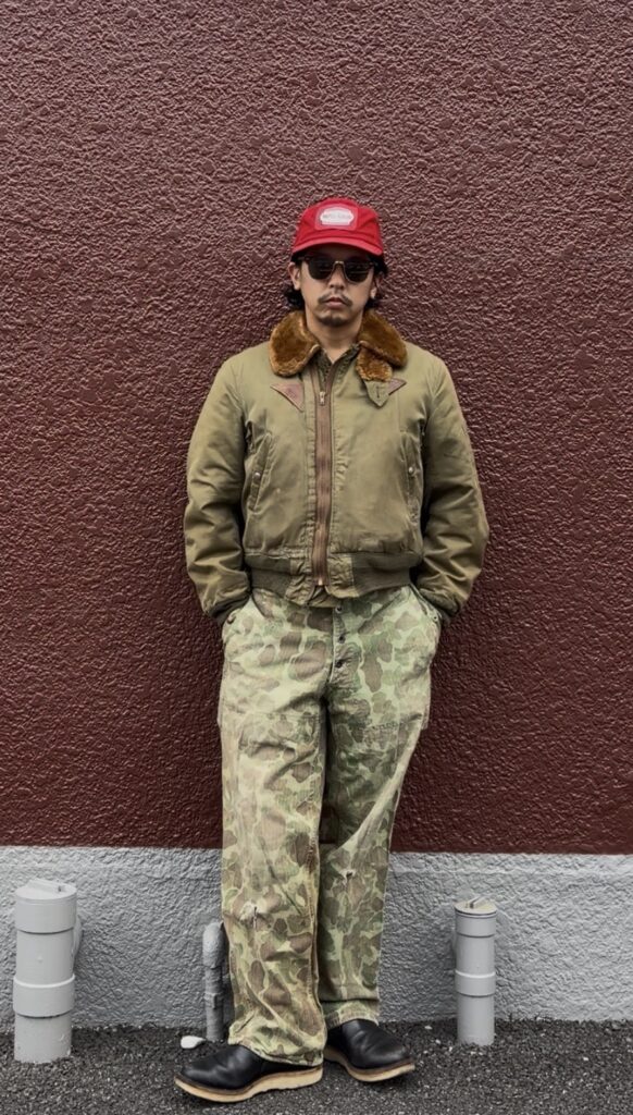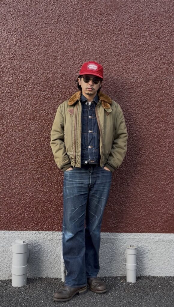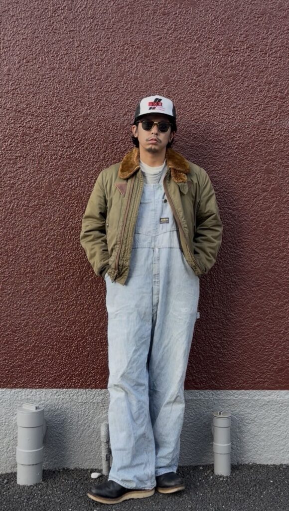 思い切ってワークテイストに振り切ったコーデ!キャップはバドワイザーのレーシング系の物。キャップ、オーバーオール、ブーツでワーク感を出しつつ、B-15Aを羽織っても全く違和感なく決まるのがこのコーデ!!B-15Aはワーク系に振り切っても面白い!!