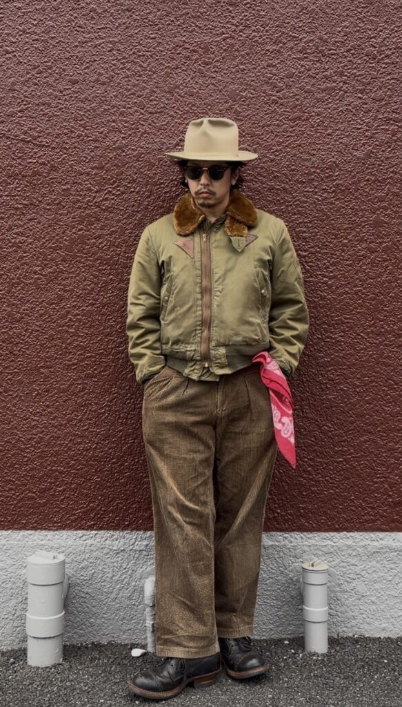 B-15Aとコーデュロイパンツでややレトロな雰囲気のコーデに仕上げました!パンツのボリュームに負けないようにゴツめのWHITE’Sのブーツで下半身はワイドシルエットに。上半身はジャストでAライン感を出しつつ、ハットはクラウンの高めの物をチョイス!バンダナで差し色入れて完成!!