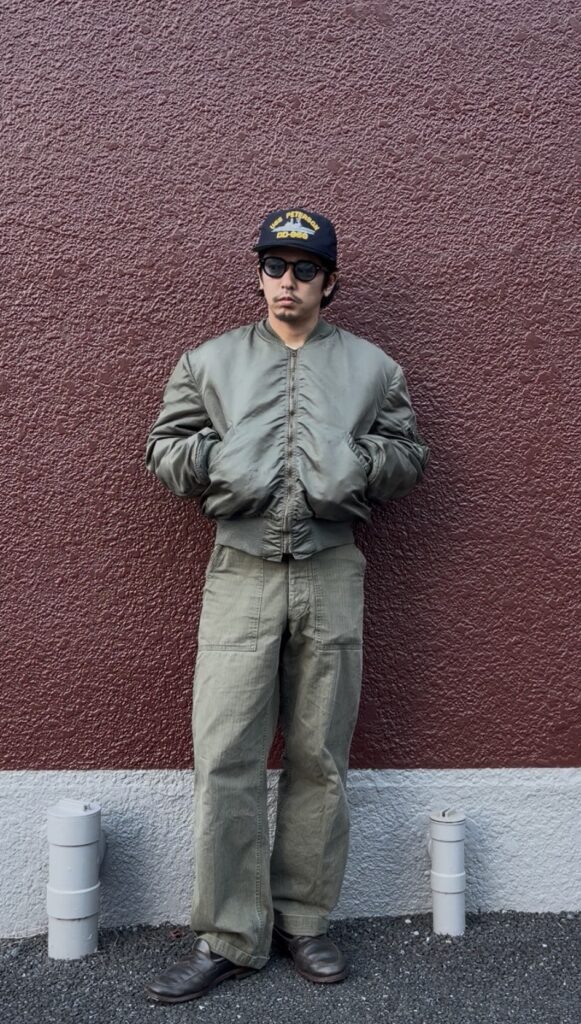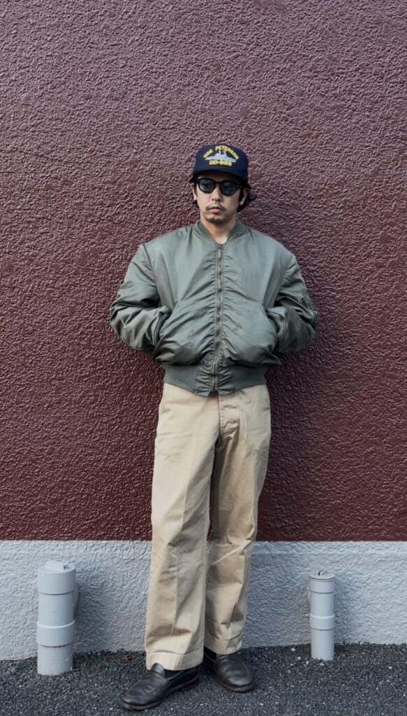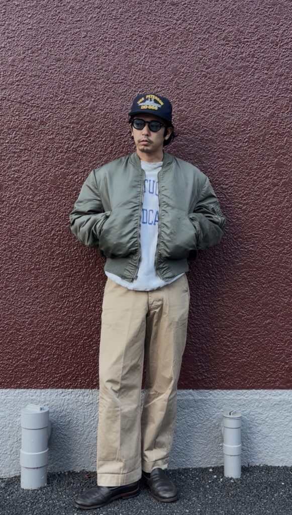 MA-1は軍物の洋服であり、ここに軍物のパンツを合わせると軍のコスプレ感が出てしまいます。
