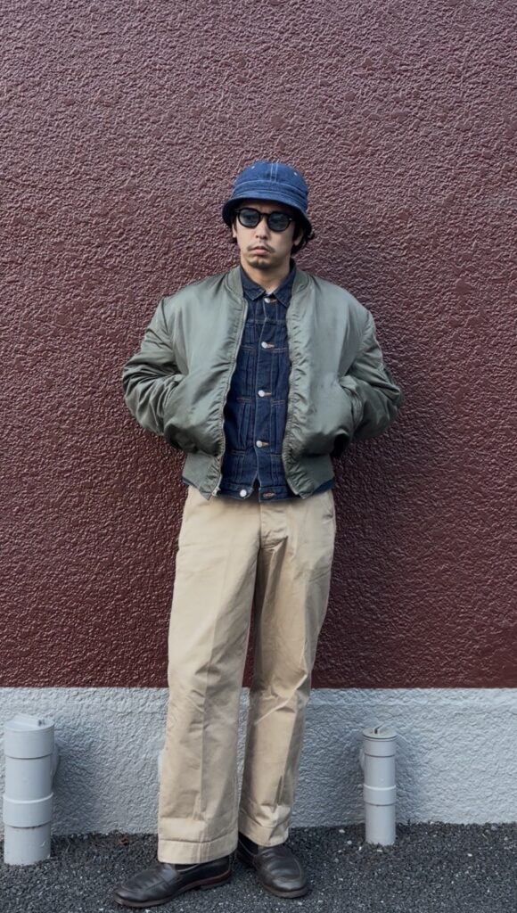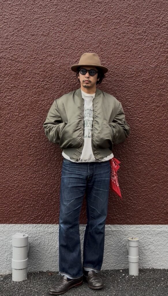 MA-1の色味の合うパンツを一つ挙げろ!と言われたら間違いなくデニムパンツを選びます!オリーヴカラーとインディゴブルーはもはや最強の相性ですね!