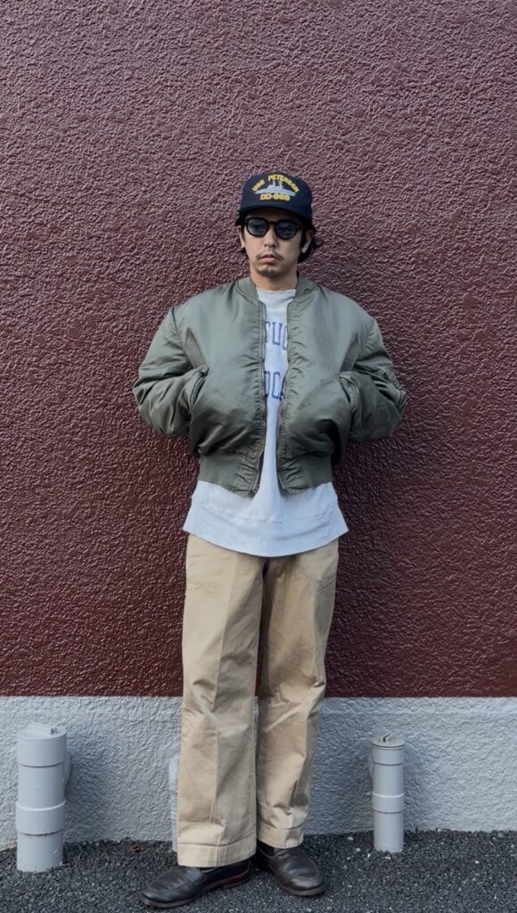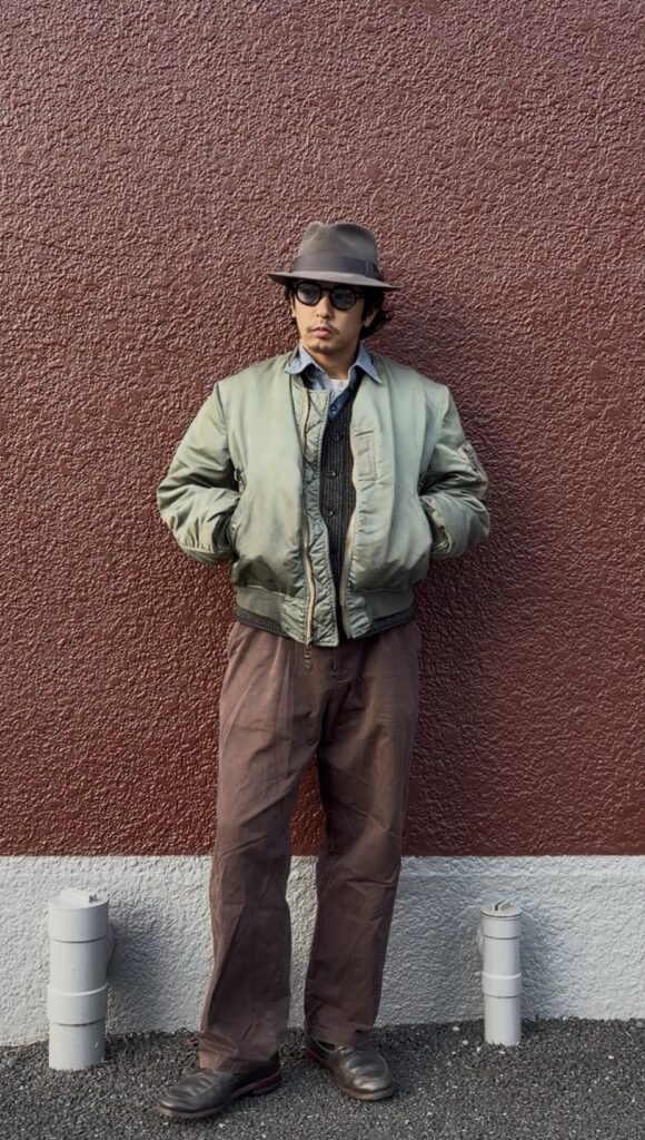 インナーのごま塩ベストも綺麗目で色のトーンが抑えられているので全体的に渋く大人なMA-1の着こなしを演出しました!