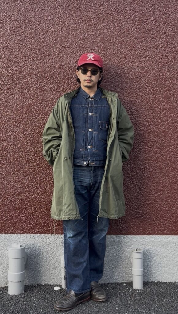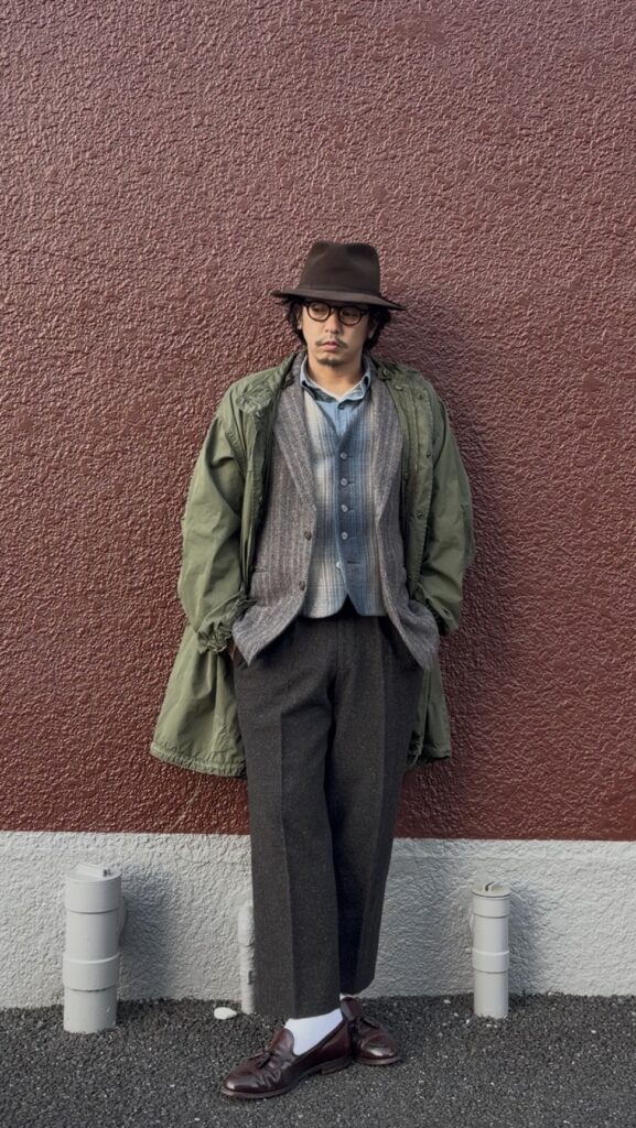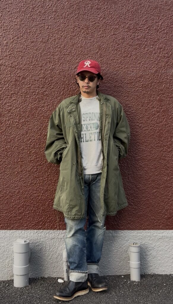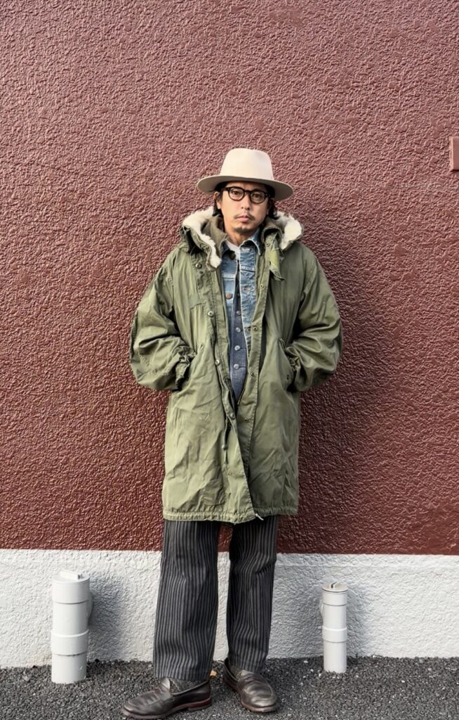 もともと軍用として作られたM-65モッズコートは、サイズ感も独特で、街着として着こなすには少しハードルが高く見えるかもしれません。