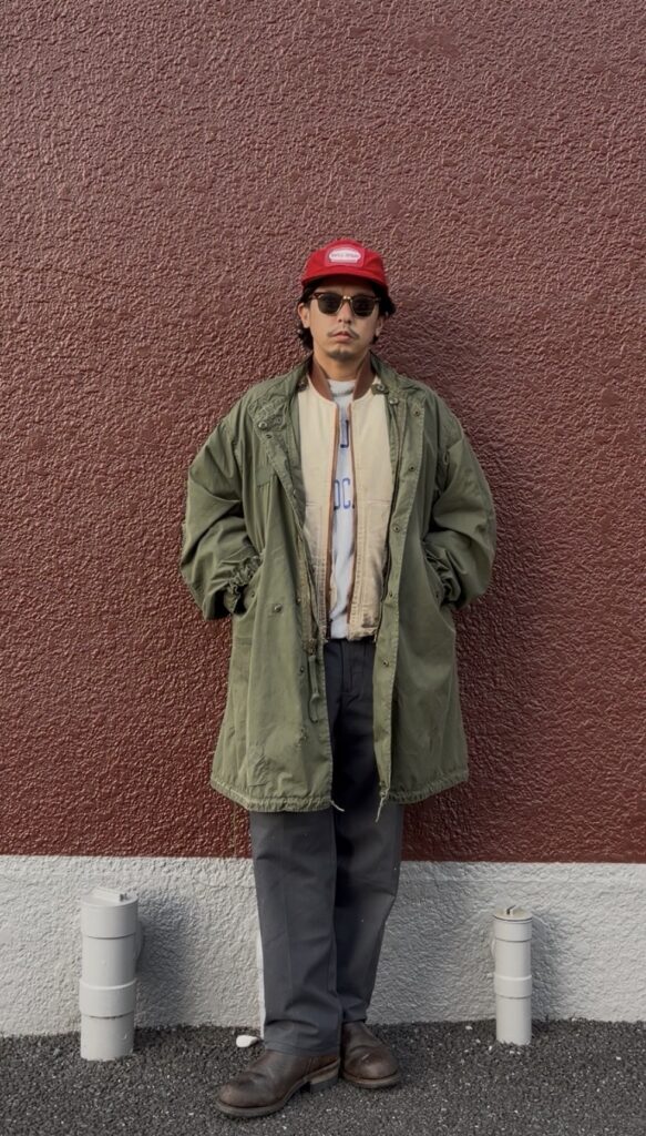 キャップは赤をチョイスし、M-65のオリーブ色の反対色を入れて差し色に!差し色映えるワークテイストのM-65コーデの完成!!